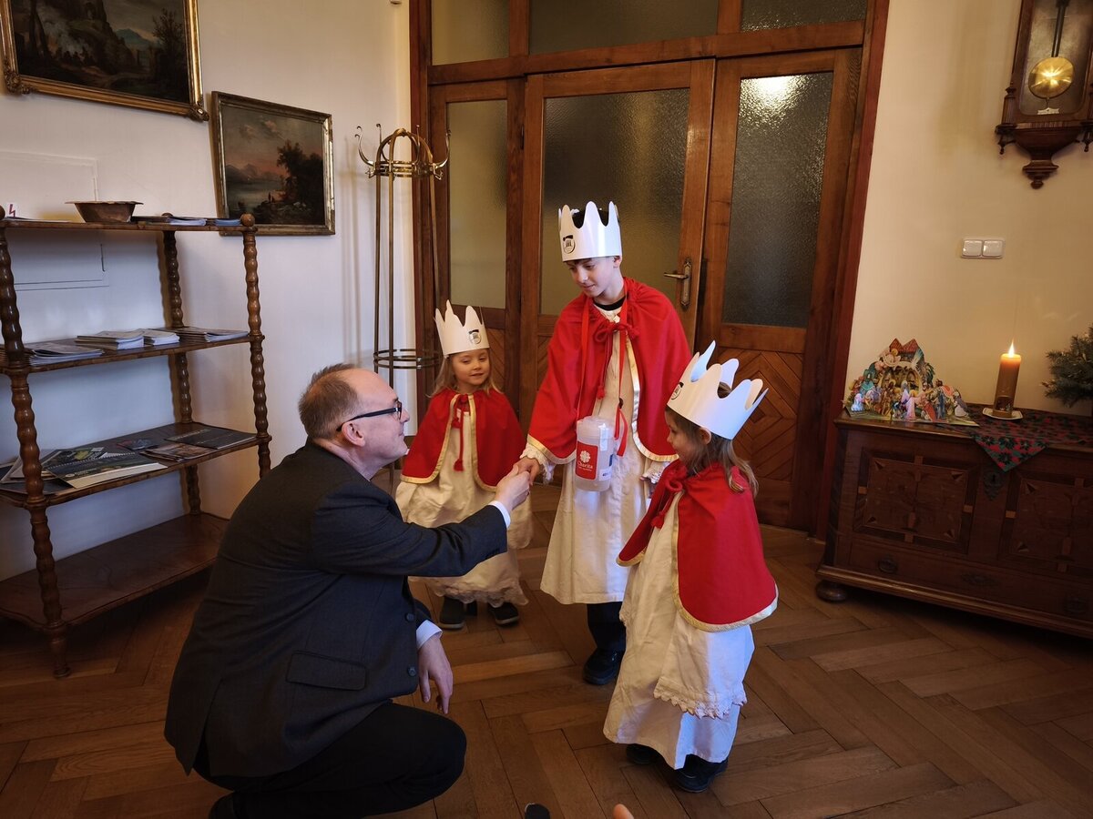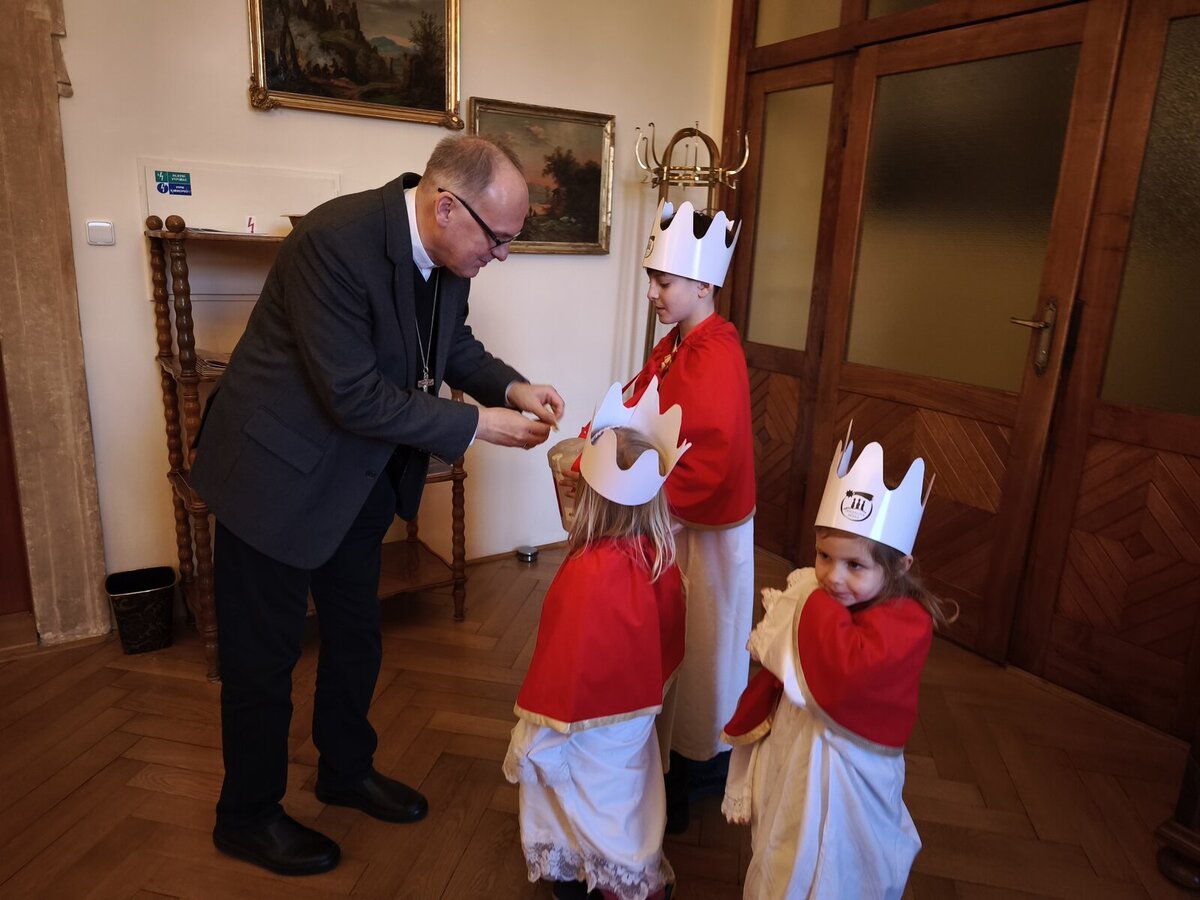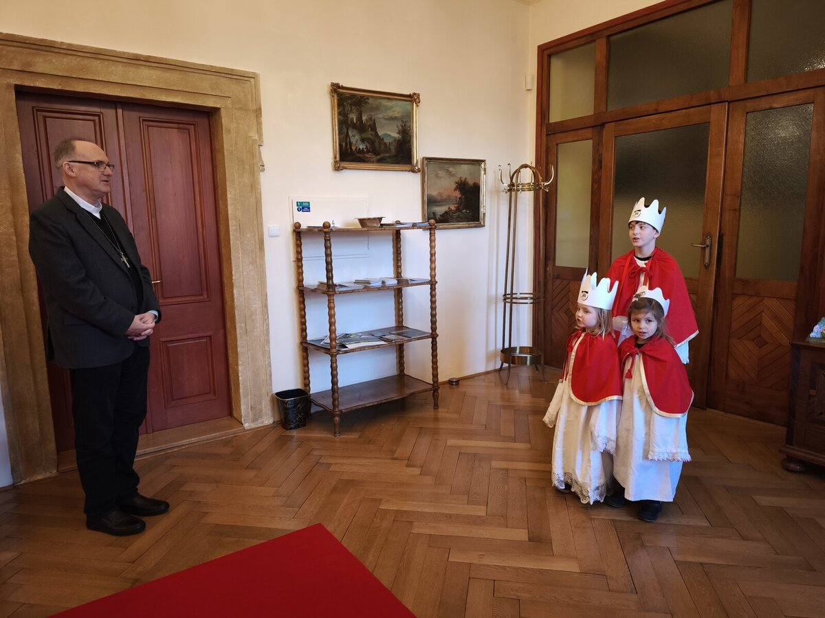 Pan biskup si na malé koledníky vyčlenil čas, vřele je přijal a vytvořil jim prostor, ve kterém se mohli cítit opravdu vítaní. Nechybělo pohoštění ani drobné dárky, ale především přátelská atmosféra a otevřený rozhovor. Koledníci se nebáli klást zvídavé otázky a pan biskup na ně s úsměvem odpovídal. Setkání bylo plné radosti i lidské blízkosti, která ke svátku Zjevení Páně neodmyslitelně patří.