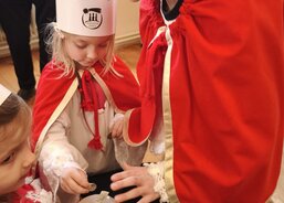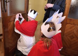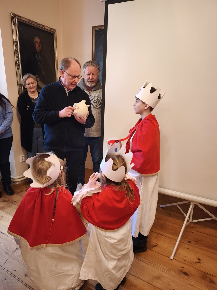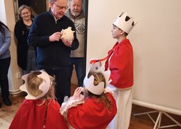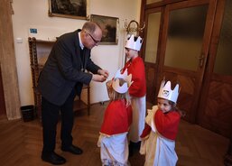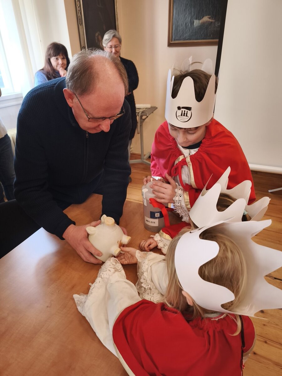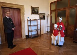 Po návštěvě v biskupské rezidenci se tři králové vydali také na litoměřickou kurii. I zde na ně čekalo srdečné přijetí a tradiční předání kasičky v podobě prasátka, do něhož zaměstnanci ukládali své příspěvky pro koledníky Tříkrálové sbírky. Prasátko si koledníci převzali z rukou generálního vikáře Radka Jurnečky.